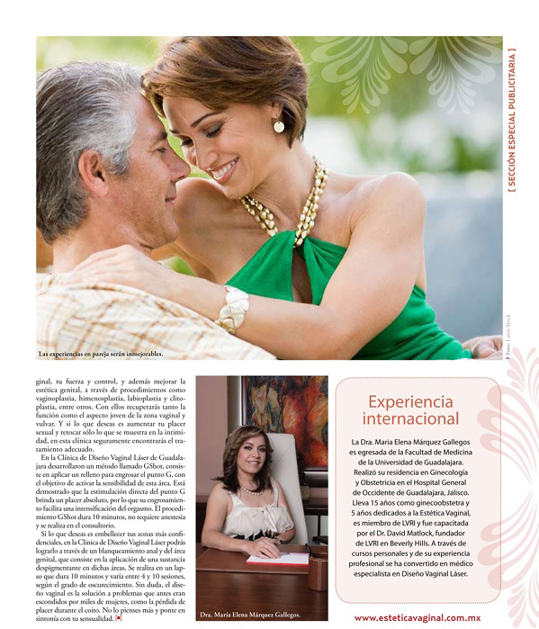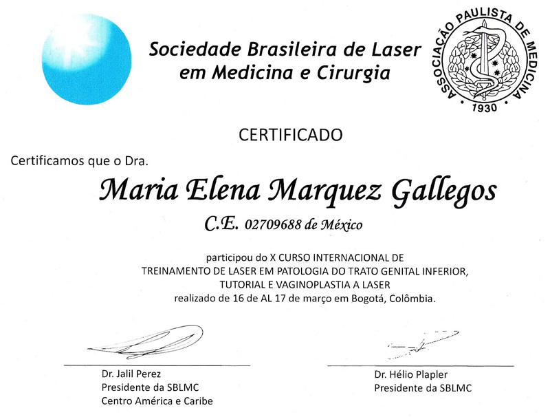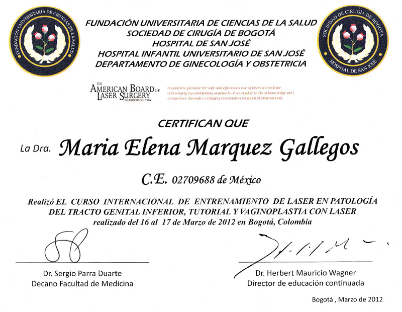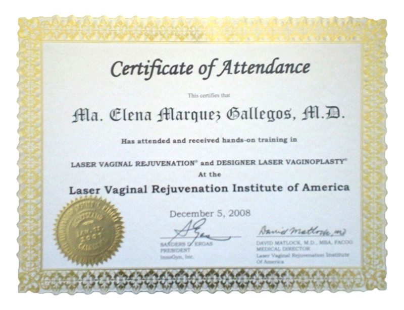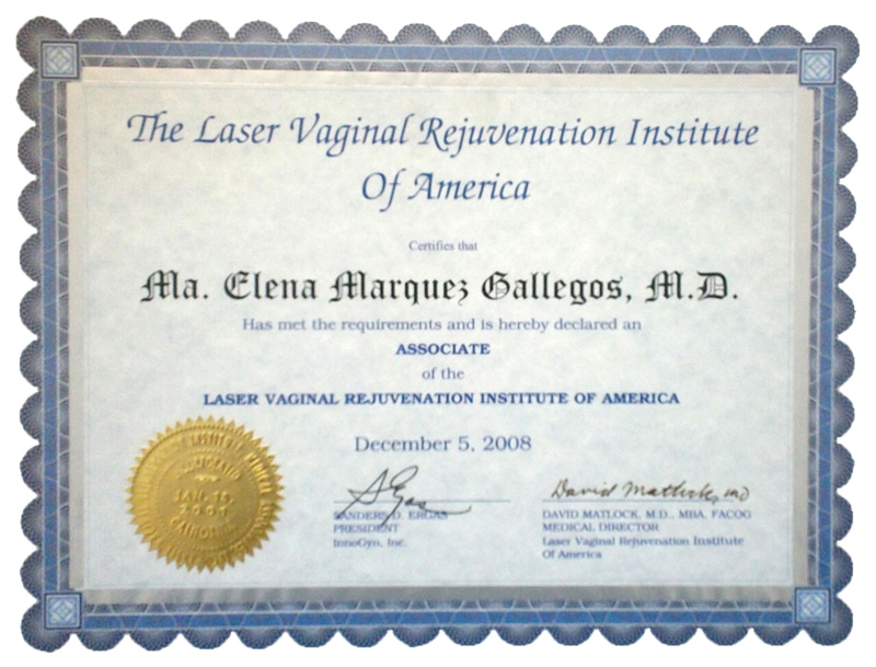 Dr. María Elena Márquez-Gallegos graduated from the School of Medicine of the University of Guadalajara, has been a recognized gynecologist and obstetrician for over 15 years, and specializes in vaginal aesthetics. She is an active member of the Laser Vaginal Rejuvenation Institute of America in California, and has attended courses given by Sociedad de Salud de Bogotá and Sociedade Brasileira de Laser em Medicina e Cirugia. She has been certified in Los Angeles, California, by Dr. David Matlock, creator of proprietary techniques for laser vaginal rejuvenation (LVR) and laser vaginal design (LVD).